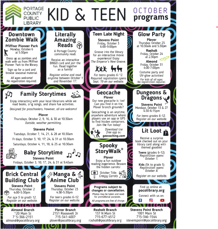 Event Registration Click HERE to register for upcoming youth events. All Branches - October 2025 Youth Events Image Stevens Point Branch - Fall 2025 Image Stevens Point Branch - Fall 2025 Image